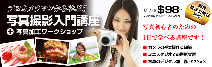 イベントや記念写真、商品写真、広告用イメージ写真など、プライベートからビジネスまで必ず役に立つ必見講座です。