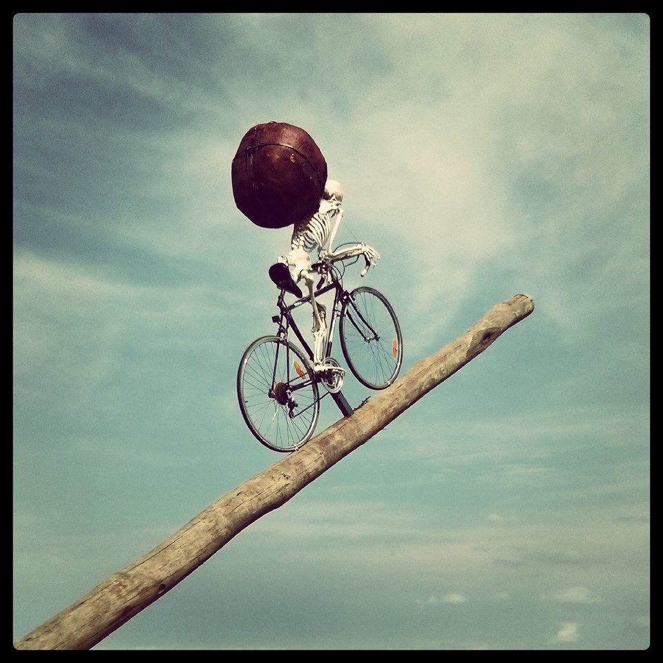 実際のコンセプトはわかりませんが、天国に向かう途中なのか、山ほど荷物をしょい込んだ骸骨さん、チェックインバックは27kgまでですよー!