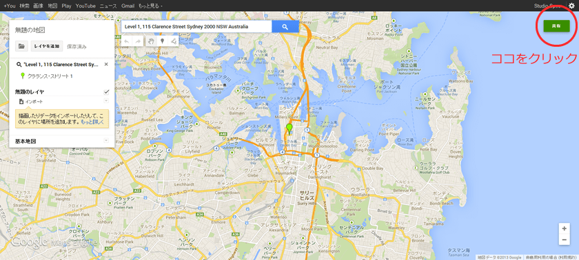 住所を入力。掲載したい倍率にしたら右上の共有をクリック。
