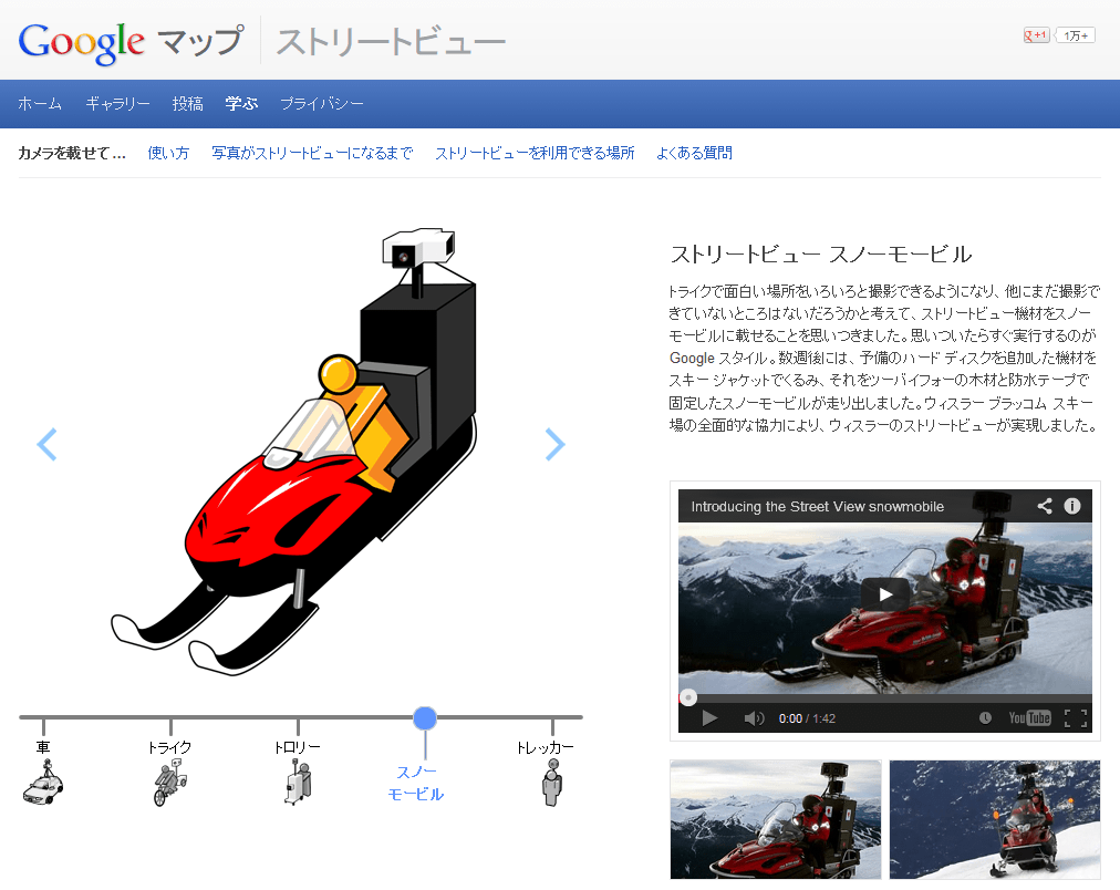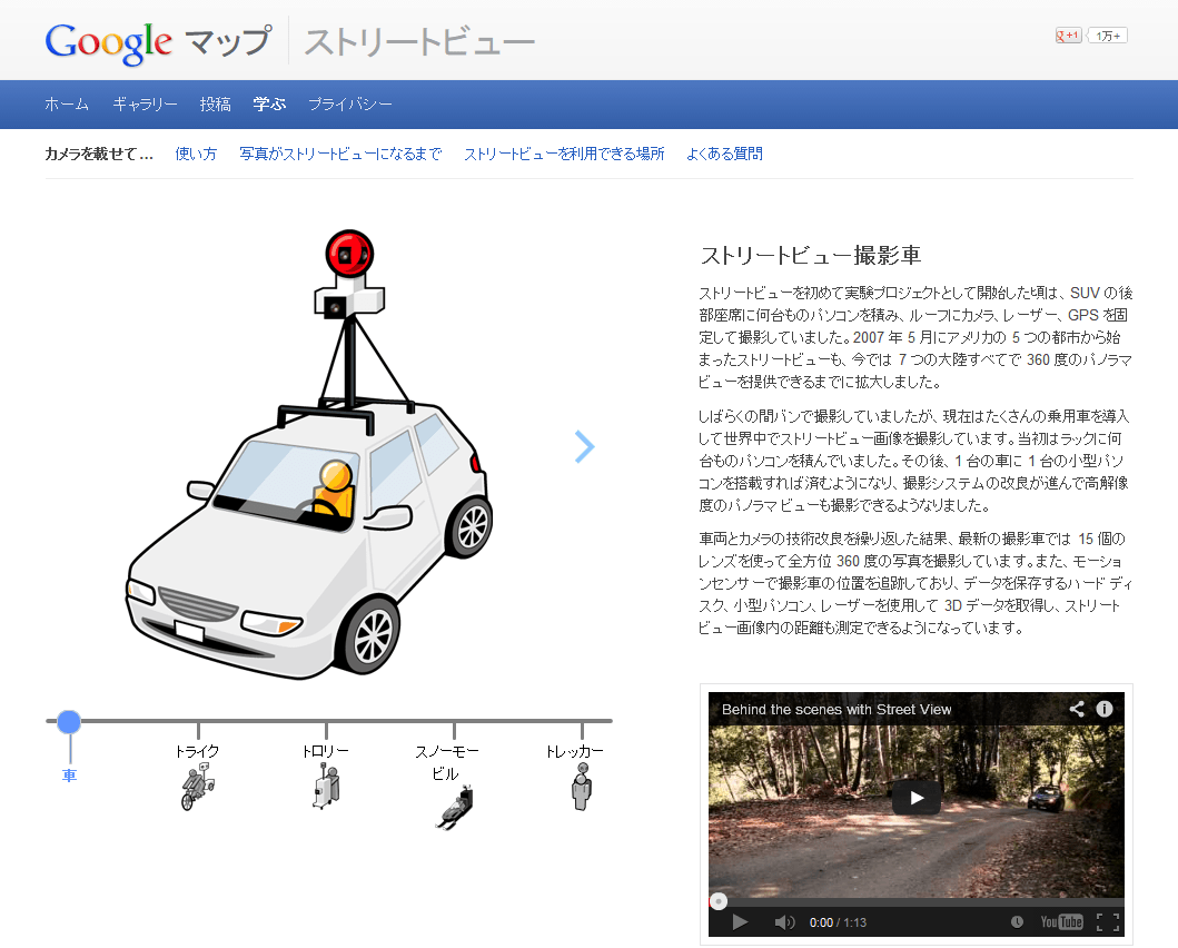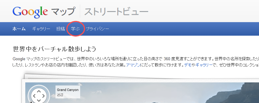 ナビゲーションの学ぶボタンをクリックするとストリートビューの作られ方や撮影方法等のストリートビューに関する情報を得る事が出来ます。