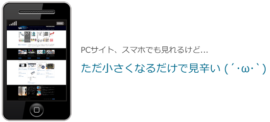 もちろん何も手を加えない状態のサイトをスマートフォンなどで閲覧したら、単純にサイトのサイズが小さくなるだけでとても見辛いです。